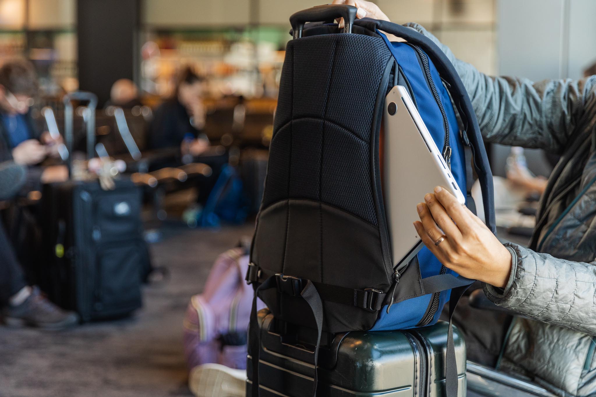 We know many of you like to use our bags as personal items alongside roller luggage when traveling, so we added a pass-through pocket to the Synik, tucked between the back panel and the internal frame.