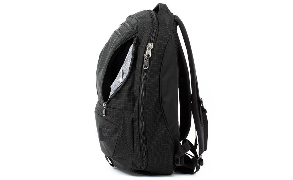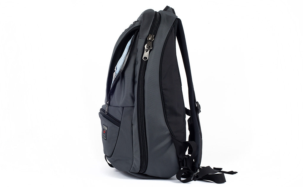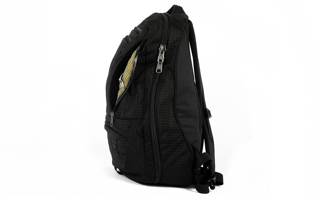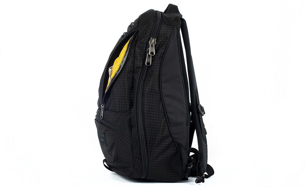 On the back interior side of the main compartment is also a built-in zippered laptop compartment. It is made with the same padded foam fabric as our Cache on the side facing the main compartment, and backed by the main lining fabric of the bag. The laptop compartment is suspended off the padded bottom of the bag, ensuring that your laptop is protected each time you place your backpack on the ground, whether gently or not.