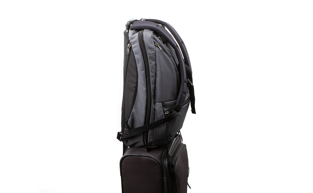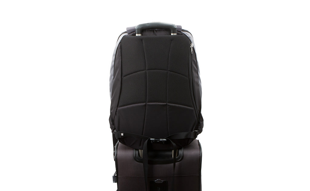 We recommend making sure that the internal frame is closest to the bag itself and the handle of your rolling luggage is on the outside of the frame. This ensures that there's a barrier between the laptop compartment and the luggage handle.